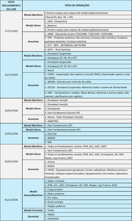 O cronograma de desligamento foi aprovado em reunião do Comitê Executivo do SISCOMEX e sua efetivação dependerá de validações feitas pelo setor privado no âmbito do Subcomitê de Cooperação do CONFAC, conforme Plano de Ação divulgado em sua 10ª Reunião.