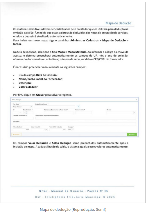 A Secretaria Municipal de Finanças (SEMF) orienta que, a partir de agora, todas as notas fiscais emitidas nos itens 7.02 e 7.05 da lista de serviços devem seguir essa nova sistemática. O contribuinte não deve mais utilizar deduções presumidas, mas sim o chamado “mapa de dedução”, disponível no sistema de emissão de nota fiscal.